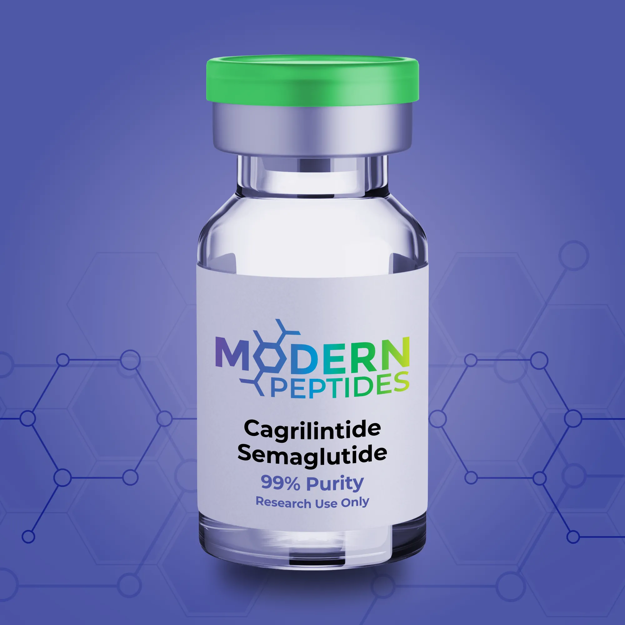 Cagrilintide is a long-acting amylin analog designed to regulate appetite and food intake by mimicking the physiological effects of endogenous amylin. It enhances satiety by acting on the area postrema in the brain, leading to reduced food consumption and mass loss. Semaglutide is a synthetic research peptide designed as a potent agonist of the glucagon-like peptide-1 (GLP-1) receptor. It is widely studied for its role in regulating glucose metabolism and energy homeostasis. Due to its long-acting properties, Semaglutide has become a key subject in scientific exploration aimed at understanding the mechanisms of GLP-1 receptor activation and its impact on metabolic pathways.